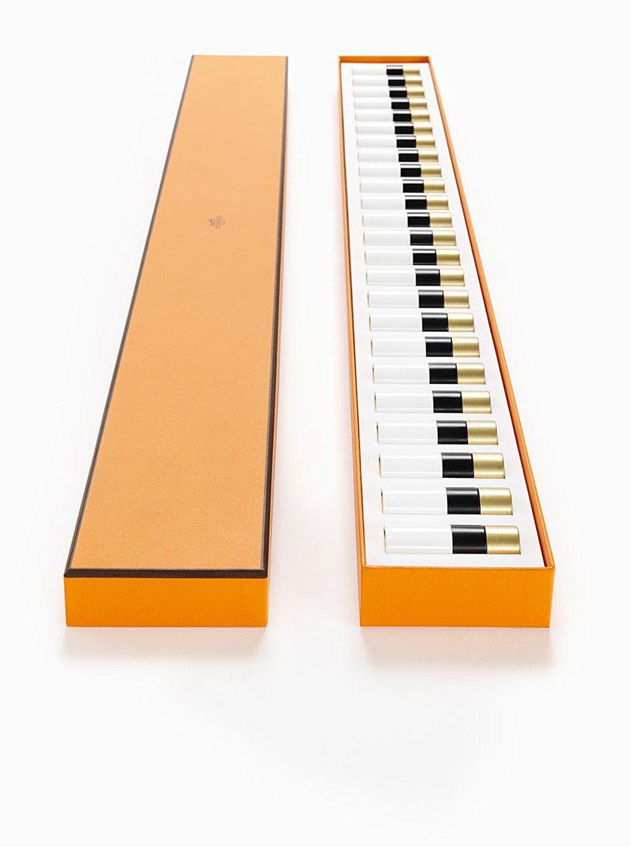 繼9月份的秋冬限量色系列,Hermès又打造了另一款限量440盒的「24色鋼琴唇膏禮盒」,定價1,500歐羅(約港幣13,600元)。從最具識別度的橙色包裝開始,到禮盒裡精選的24種Rouge Hermès唇膏顏色,包含10款啞霧面與14款柔緞質地。打開禮盒,你會發現一字排開的唇膏均採用黑、白、金的設計,就像鋼琴的琴鍵,優雅奢華兼具,這必定是三心兩意的女生們入手Hermès唇膏的好時機!